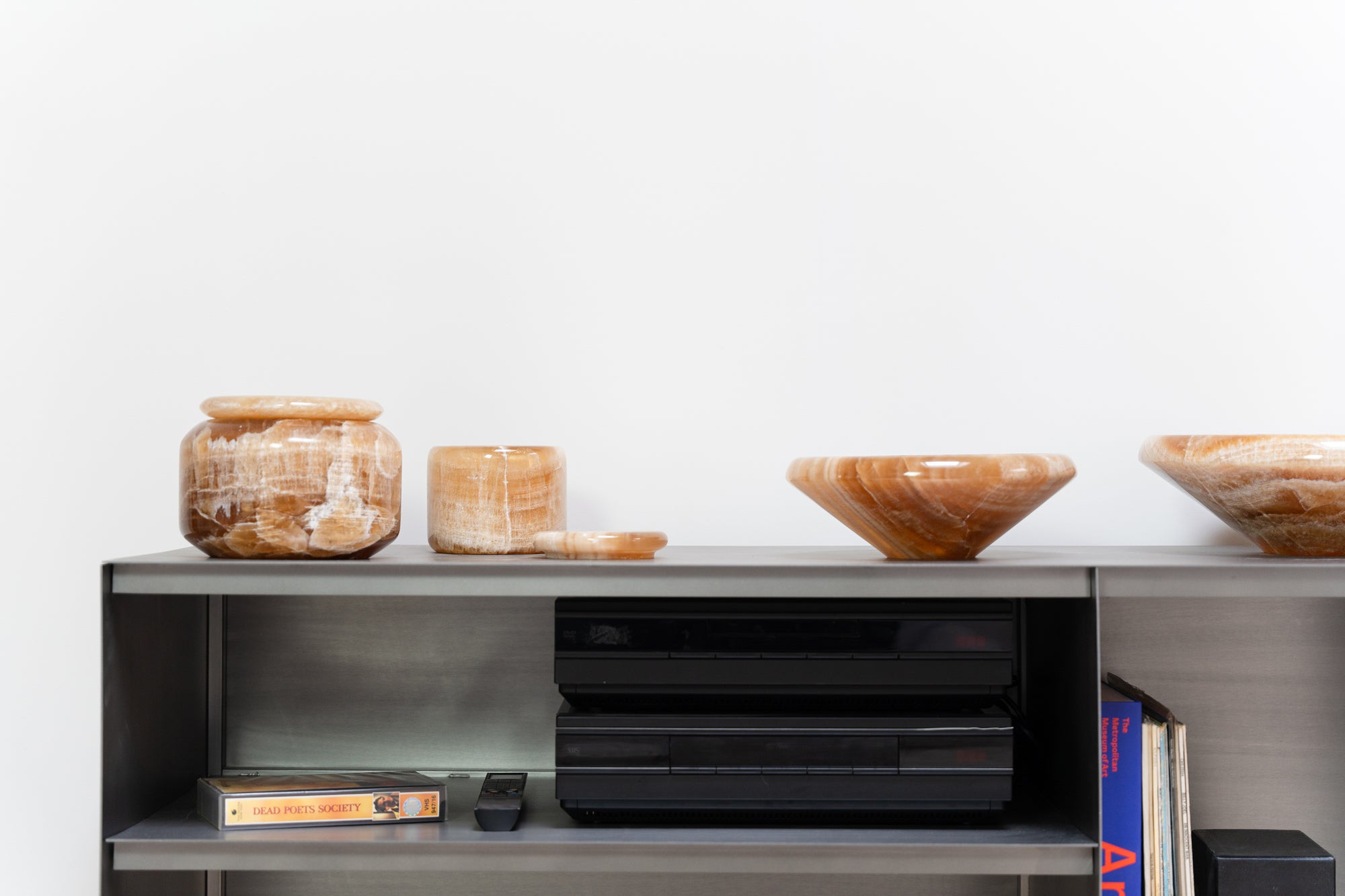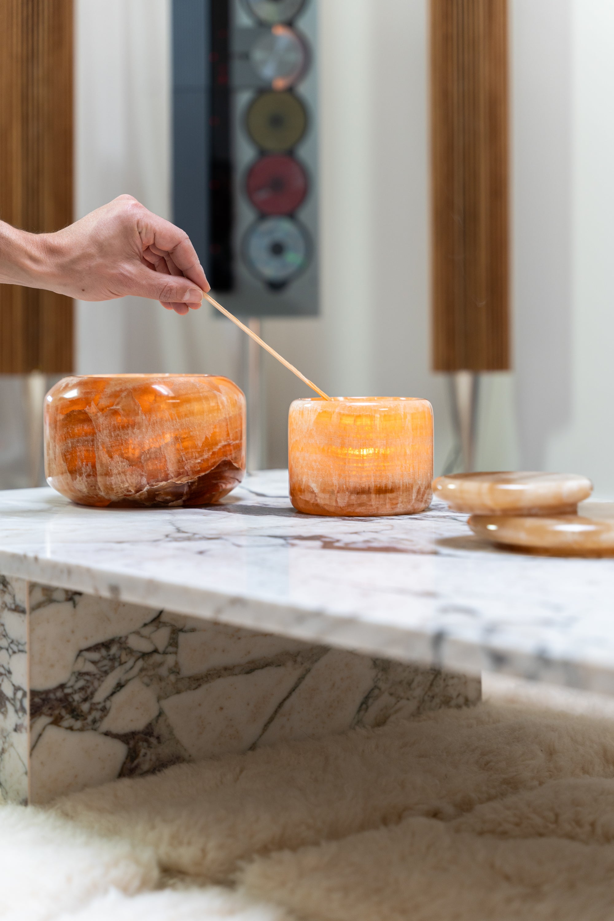 Ontworpen in bruin onyx: twee schalen en twee decoratieve potten als verfijnde interieuraccenten. De warme tinten en subtiele translucentie zorgen voor een rustige, elegante uitstraling. Met een kaars creëren de potten een zachte gloed. Iconische stukken die elke ruimte moeiteloos verrijken.