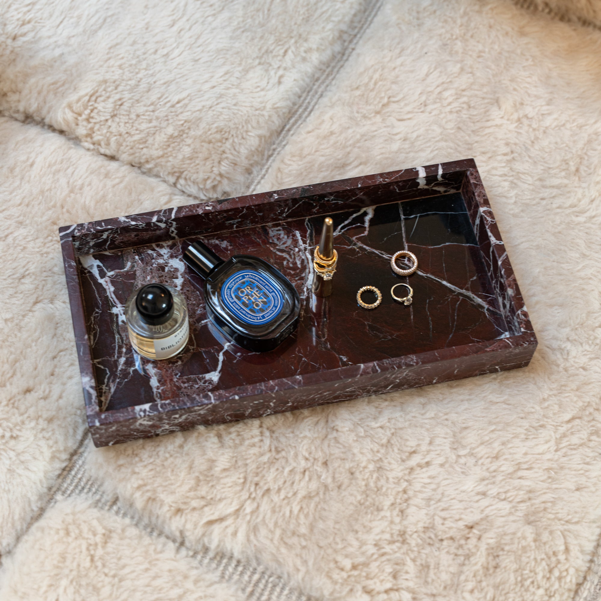 Onze Burgundy Marble Tray voegt een vleugje luxe en functionaliteit toe aan elke ruimte. Gebruik hem in de badkamer om je favoriete schoonheidsproducten of parfums te etaleren, in de keuken om uw kookbenodigdheden te organiseren of in de woonkamer als basis voor kaarsen om zo een warme ambiance te creëren.