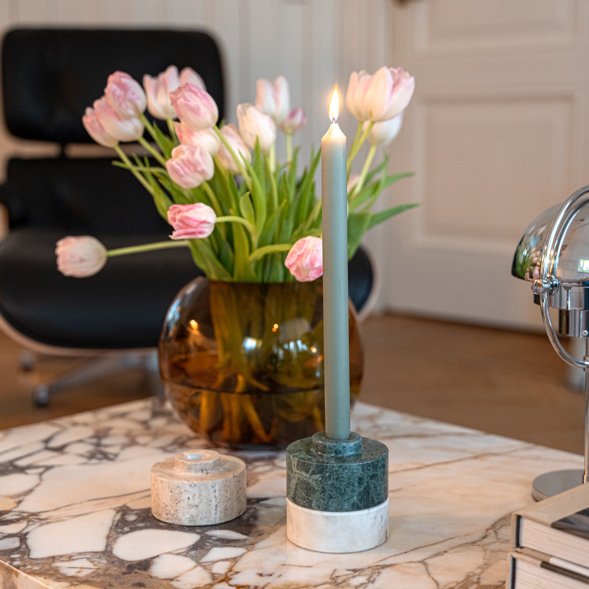 The Switch Candle Holder is designed to adapt to the moment. Carved from solid green marble, this sculptural piece is both reversible and stackable, allowing you to switch between a dinner candle and a tealight with a simple turn.