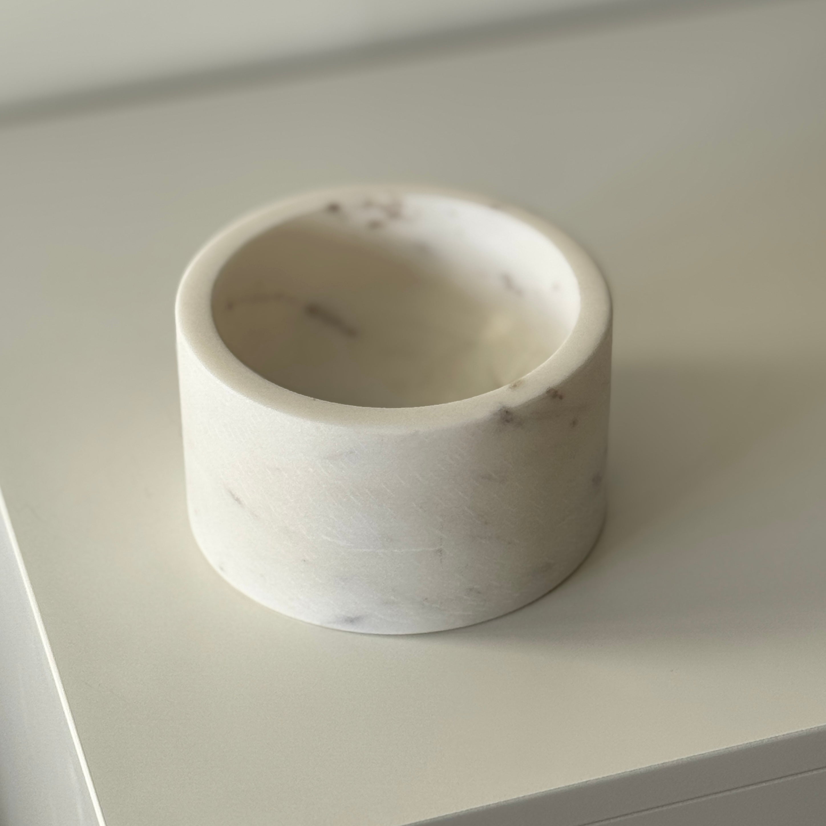 Een eenvoudige schaal voor dagelijks gebruik, gemaakt van gezoet wit marmer. De matte afwerking en natuurlijke adering geven elk stuk een unieke uitstraling. Geschikt voor sieraden, sleutels, kruiden of gewoon als mooi object in huis.