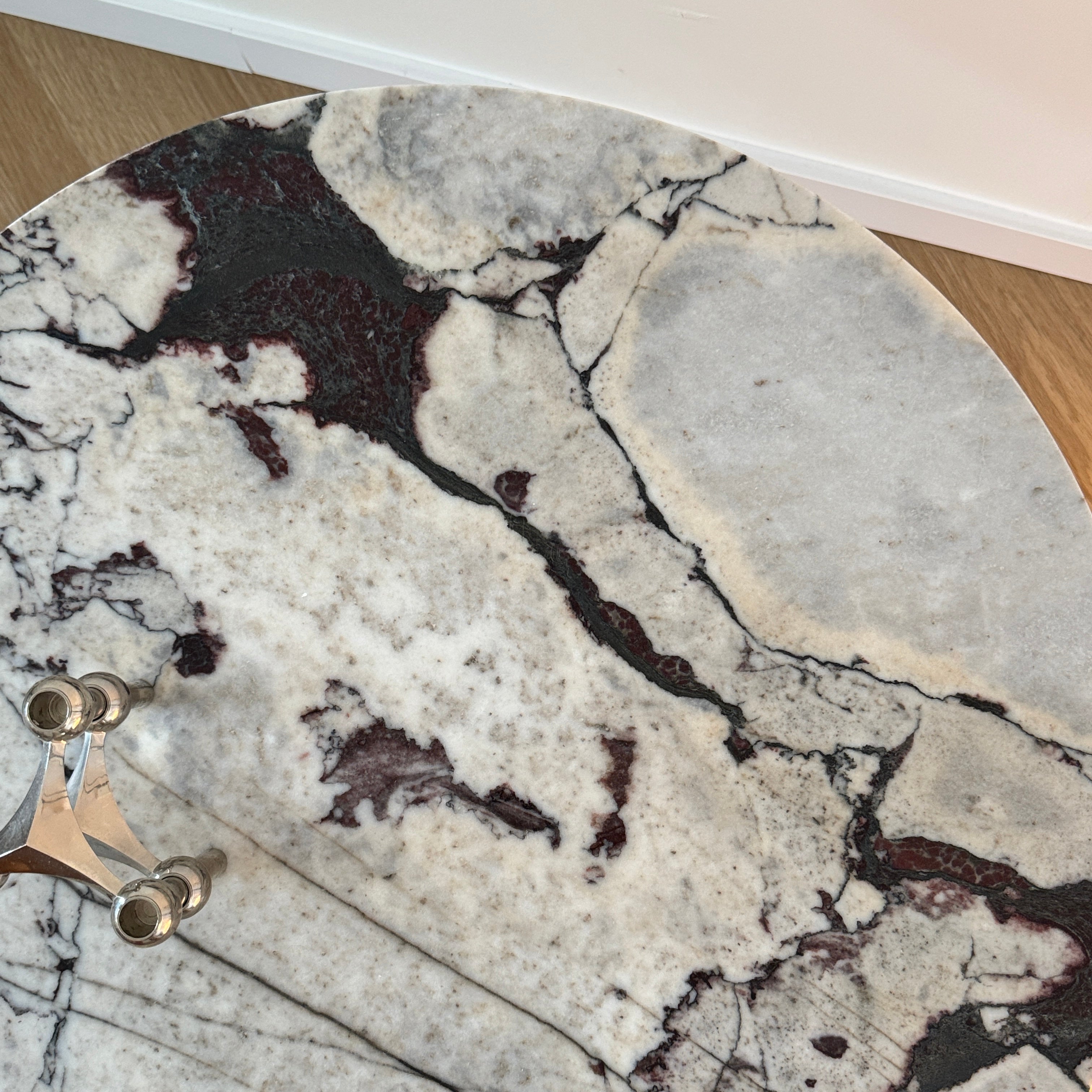 Een perfecte combinatie van verfijning en functionaliteit, deze ronde marmeren bijzettafel voegt een vleugje tijdloze luxe toe aan elke ruimte. De natuurlijke adering en het strakke silhouet maken het een statement piece dat zowel moderne als klassieke interieurs aanvult.